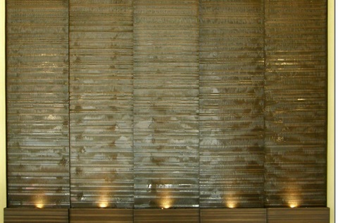 Linear Cascade is a wall installation consisting of 5 stepped, textured vertical panels. Water flows down the irregularly patterned copper, disappearing into a trough at the sculpture's base. The sculpture floats above the reception area where it is located with ever changing water currents.