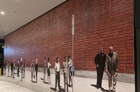 This concept was inspired by the cast of characters who have become intertwined with the unique demographic Los Angeles, alluding to a shopping center that might exist just out of the frame in the photograph. Los Angeles is synonymous with these mini shopping malls as they serve as focal points for one’s experience of the city. The store names are meant to elicit a feeling of familiarity and nostalgia These hybrid images, a conflation of two realities, force the viewer to consider what is real and what is constructed. Individuals can experience the work as the figures in the piece itself - walking down the street, or perhaps driving into the garage.